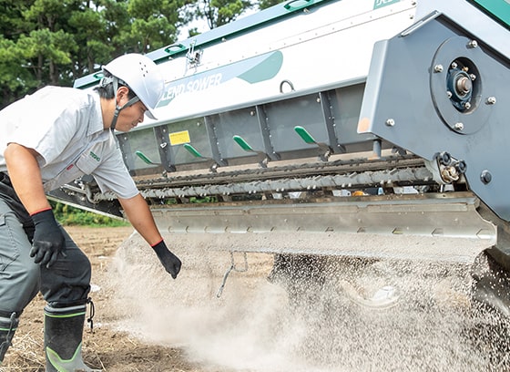 独自に開発した混合羽根により、肥料がムラなく混合できます。肥料の比重に関係なくきれいに混ざるので、けいふんや米ぬかなどの有機肥料においても安定的な施肥設計が立てられます。